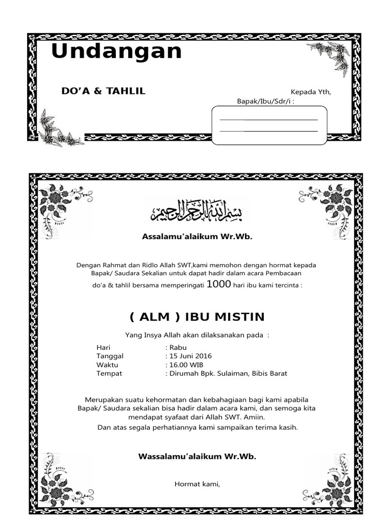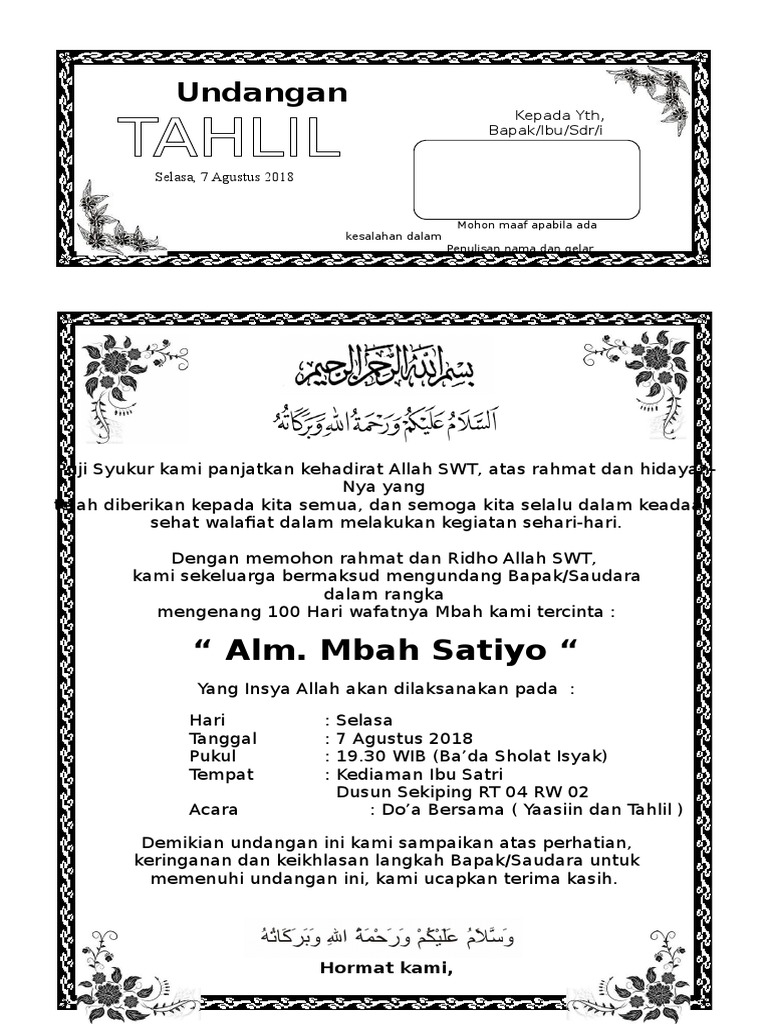 DOC) Contoh Surat Undangan Tahlil 40, 100, 1000 hari | Teja Sukmana - Academia.edu
