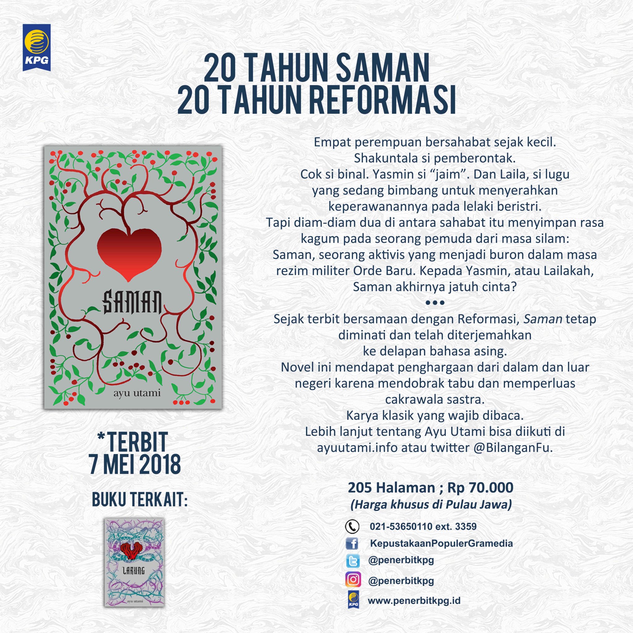 Penerbit KPG on Twitter: “Novel #Saman telah dicetak sebanyak 35 kali sejak pertama kali terbit pada April 1998. Dapatkan segera edisi #20TahunSaman #20TahunReformasi di toko buku @gramedia atau pesan daring via @gramediadotcom.…