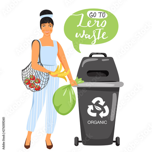 Recycling concept. Woman sort garbage into containers for recycling. Stylish typography slogan design “Go to zero waste” sign. Vector illustration. - Buy this stock vector and explore similar vectors at Adobe Stock |