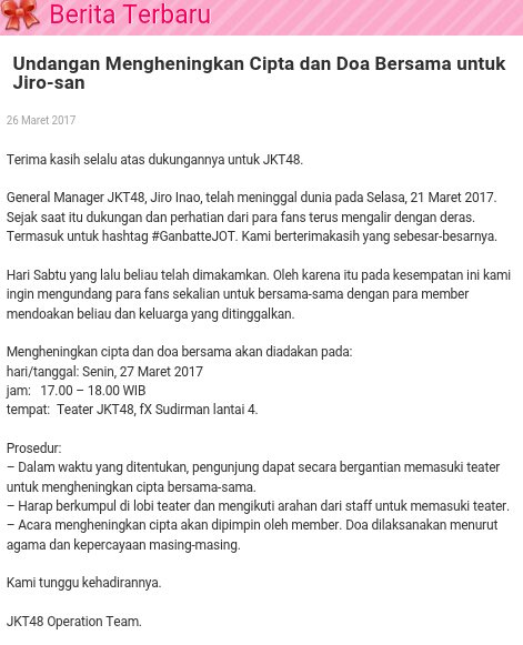 Harian_jkt48 a Twitter: “[UPDATE] Undangan Untuk FJKT48, Acara Mengheningkan Cipta dan Doa Bersama untuk Jiro-san.