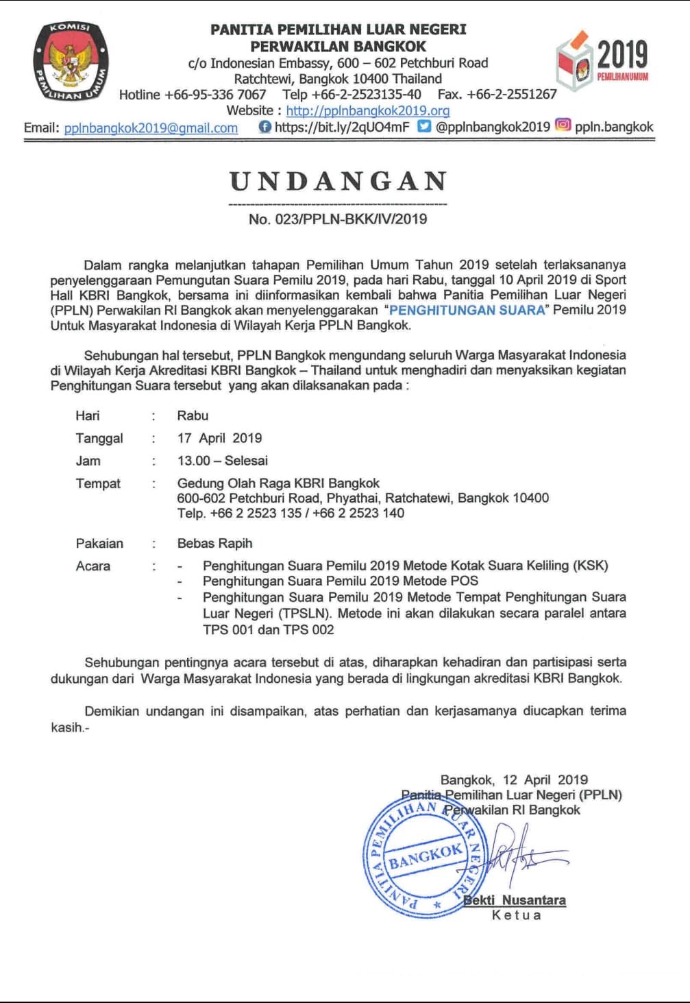 PPLN Bangkok 2019 on Twitter: “Ayo Kawal suaramu! Penghitungan suara Pemilu Serentak 2019 di GOR KBRI Bangkok, besok, Hari Rabu, 17 April dari jam 1 siang sampai selesai. #PPLNBangkokMelayani… https://t.co/sIR0v0IoWE”
