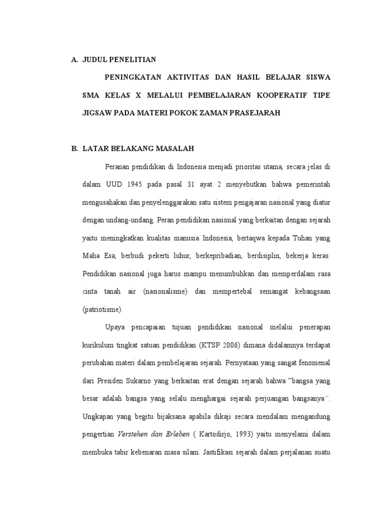 DOC) PROPOSAL PENELITIAN TINDAKAN KELAS JUDUL : MENINGKATKAN MOTIVASI DAN HASIL BELAJAR MATA PELAJARAN IPA MELALUI PEMBELAJARAN KOOPERATIF TIPE JIGSAW PESERTA DIDIK KELAS VIII SMP NEGERI 2 PARIGI KABUPATEN PANGANDARAN I. PENDAHULUAN |