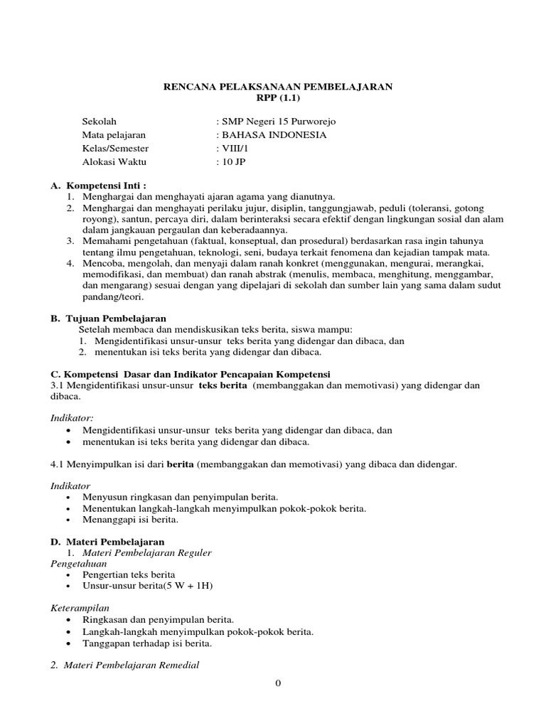 RENCANA PELAKSANAAN PEMBELAJARAN (RPP) MATA PELAJARAN BAHASA INDONESIA UNTUK SMP/MTs KELAS VIII SEMESTER I (Berdasarkan Kurikulu
