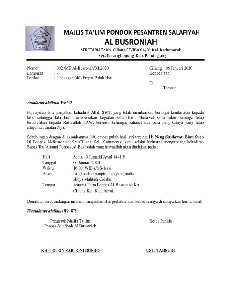 DOC) Contoh Surat Undangan Tahlil 40 100 1000 hari haul | Iciz Dlecis - Academia.edu